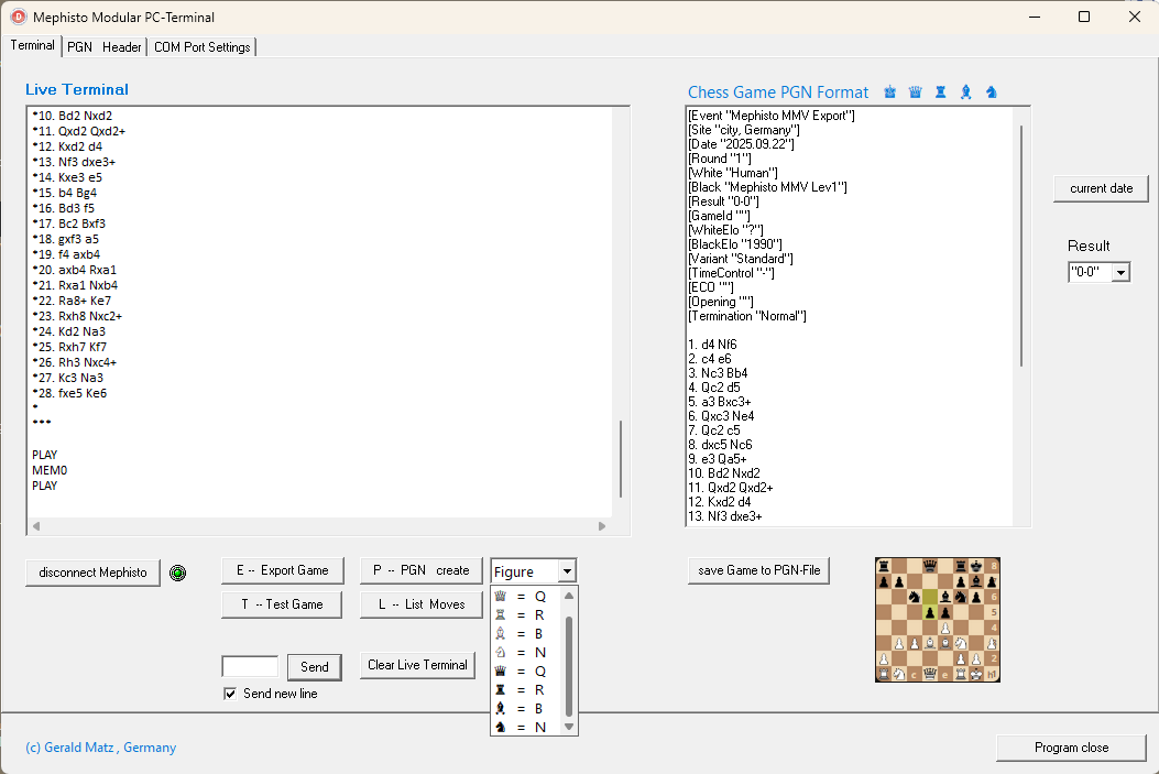 Bei den vielen Testpartien die ich prüfen musste, war mir das umherkopieren in eine PGN Vorlagendatei zu aufwendig und ich habe mir einen eigenen speziellen seriellen Monitor mit PGN Datei Speicherung in Delphi programmiert. (nur für Windows und kostet 24 € ( Brutto)! )